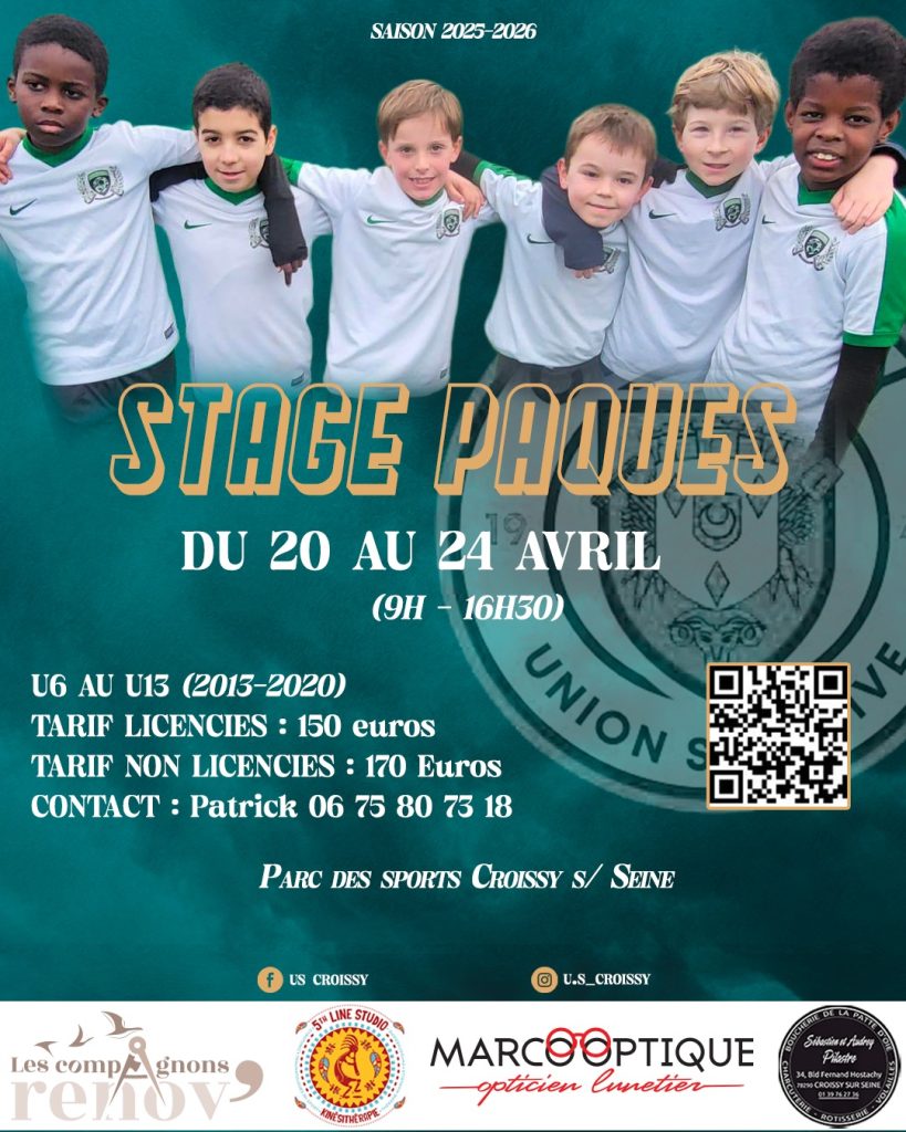 L’US Croissy Football organise son stage de Pâques du lundi 20 au vendredi 24 avril 2026 au Parc des Sports de Croissy-sur-Seine.